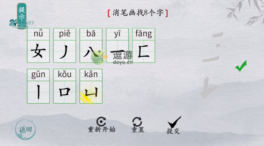 5、以上就是离谱的汉字【嬛】消笔画找8个字通过攻略