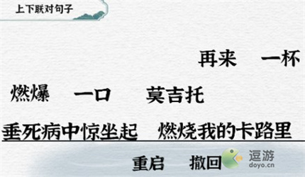 一字一句对联雄起怎么过?在“对联-雄起”这一关里面,大家需要根据上联“垂死病中惊坐起”,给出合适的下联才能过关。下面带来一字一句对联雄起过关方法,各位一起来看看吧。