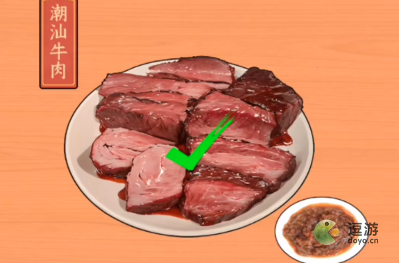 1、文字来找茬酱料搭配,首先潮汕牛肉搭配沙茶酱