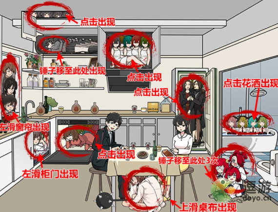 1、玩梗高手生日派对,需要在房中找到240个人,首先点击天花板、点击抽油烟机找到人
