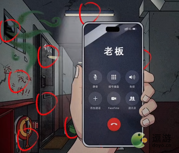 2、然后场景2:点击香炉、招租广告、亮着的猫眼、报纸、烧焦的门、闪烁的灯、血字
