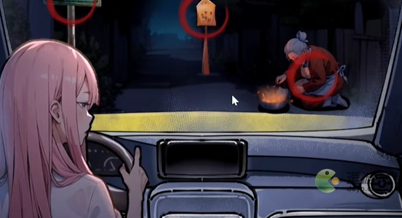 2、接着选择带走,来到车上点击老太太、路标、怪异的猫咪,滑动后视镜找到奇怪的奶奶,点击发光的平安符