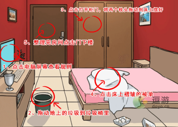 2、接着拖动地上的垃圾到垃圾桶里;点击打开柜门,将两个枕头拖动到床上摆好