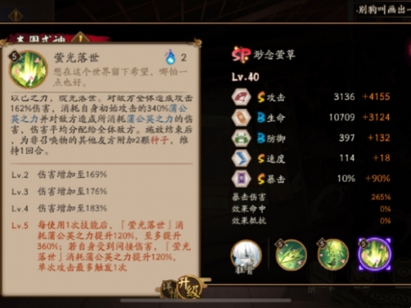 3、大招:萤光落世,可以打出两段群体伤害,可以给队友增加两颗种子,持续一回合。