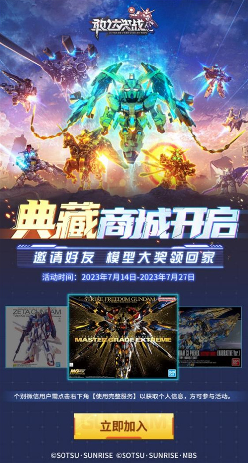 注意了,今天也是《敢达决战》7.5周年狂欢庆典开启的时间,官方还准备了全新典藏商城活动,邀请好友获取积分,即有机会免费领取金币、钻石、机体碎片以及MGEX强袭自由敢达模型等丰厚奖励,点击链接立刻参与。