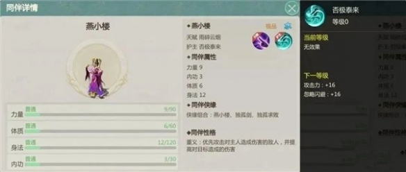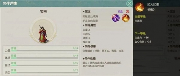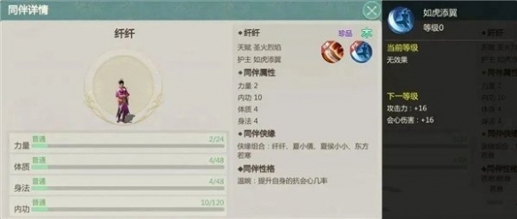 2、纤纤属性:力量2,内功10,体质4,身法4。