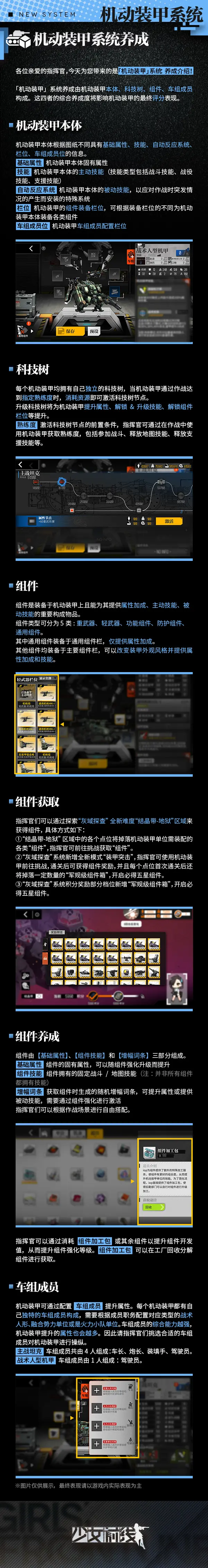 「机动装甲」系统养成由机动装甲本体、科技树、组件、车组成员构成。这四者的综合养成度将影响机动装甲的最终评分表现。