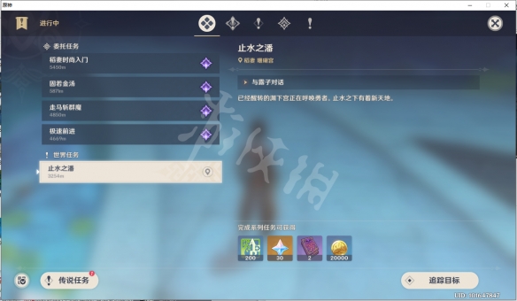 其中魔神任务与世界任务「月浴之渊」在此前都已完成,未完成的任务则只有2.4版本中新发布的世界任务「止水之潘」。