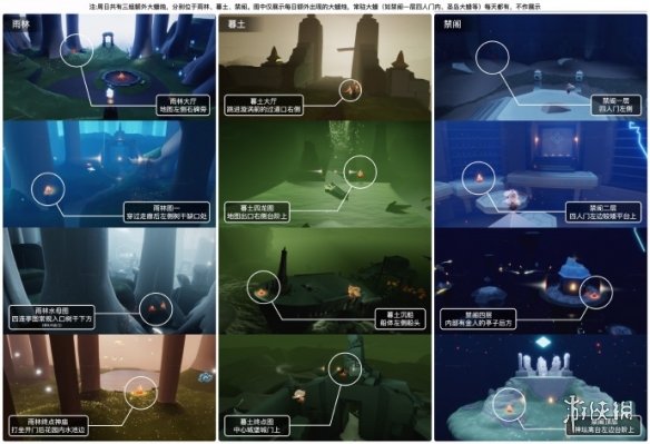 今日大蜡烛位于墓土、雨林、禁阁;小伙伴们可以参考下图进行寻找: