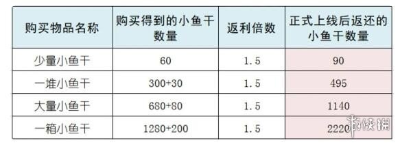 您在本次测试期间通过充值购买所获得的小鱼干(包含购买不同档位小鱼干时赠送的数量,不包含骑士团勋章和首充谢礼奖励的小鱼干),将在游戏正式上线后获得1.5倍数量的小鱼干返还,届时可前往游戏内城镇(秋梨村)的邮箱处领取。