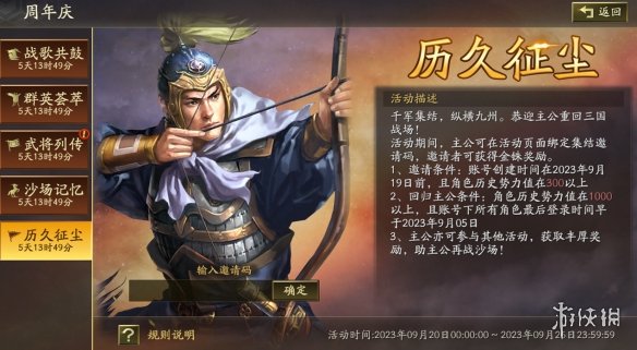 *具体赛事指南相关活动主公可继续查看本文后续解读开启时间:9月20日0:00-9月26日23:59*历史势力值大于300即可参与