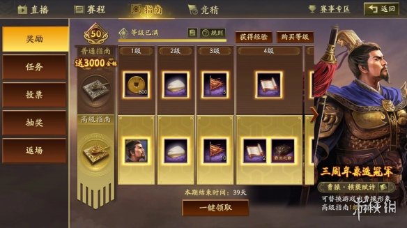在升级指南为高级指南后,主公再额外购买一定数量的等级,还可获得“曹操·对酒当歌连战播报外观(永久)”(*该皮肤无属性加成)