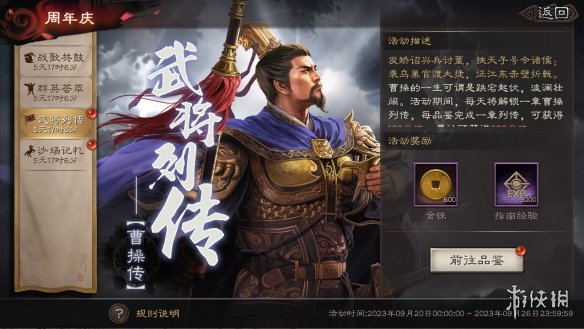 活动奖励:9月20日起,每日解锁一章列传,一同感受曹操跌宕起伏、波澜壮阔的一生。首次品鉴完成一章可获得100金铢+500赛事指南经验,共计可获得600金铢+3000赛事指南经验。