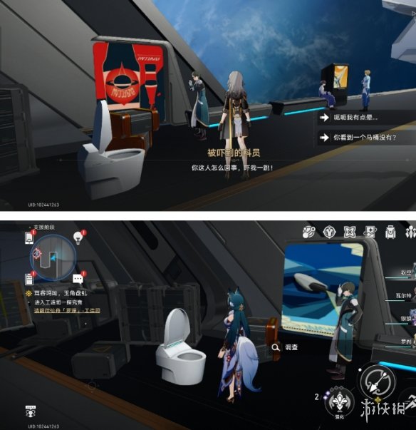 1、玩家需要前往支援舱段的下图位置找到马桶并进行调查,接着需进行对话,选框选择坐上去,按冲水键。