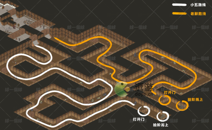2、操控机关开门,按照以下路线到台阶前,老默先上台阶后小五再上