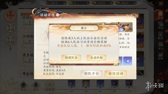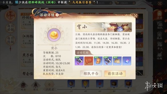 少侠可以点击【活动】-【宵小】-【前往活动】,进行组队参与。