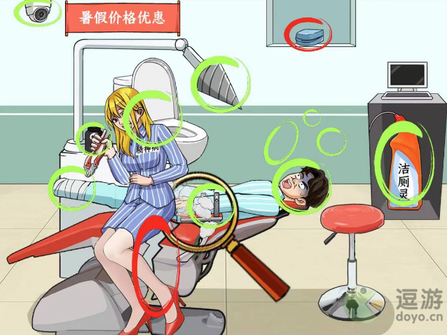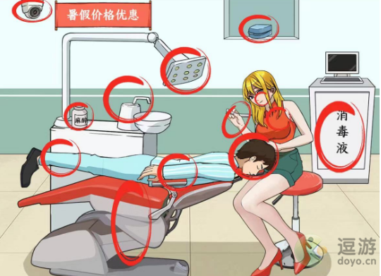 1、文字来找茬不靠谱牙医,需要帮强哥把费用打下来,首先消毒液处可以找到洁厕灵