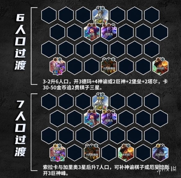 索拉卡与加里奥3星后升7人口,可补神谕棋子或厄斐琉斯开3巨神峰。