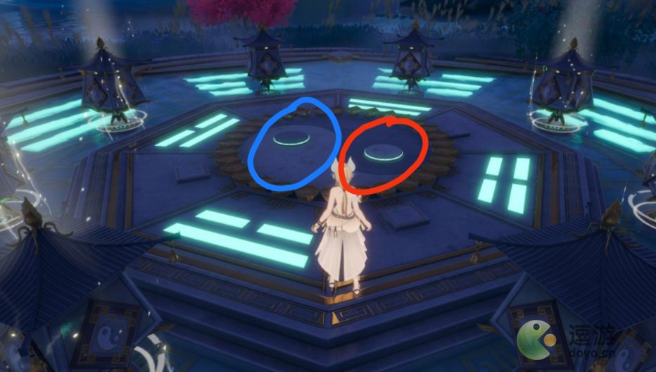 踩一下蓝圈是两条短横,踩一下红圈是一条长横,按照周围的图案依次踩后就可以激活传送门了