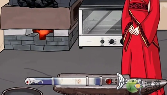 10、把剑雏形拖入火炉中烧红,再将其放到淬火桶里淬火