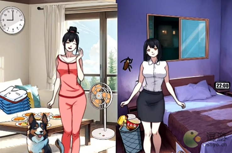 1、文字来找茬毕业住对比,需要拖动物品到对应位置,首先毕业前:挂钟、美食、落地窗、旺财、睡衣、衣服、风扇