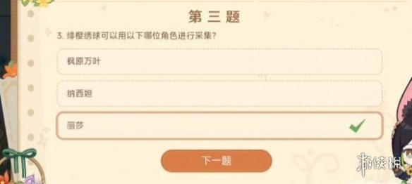 3、绯樱绣球可以用以下哪位角色进行采集?答案是丽莎。