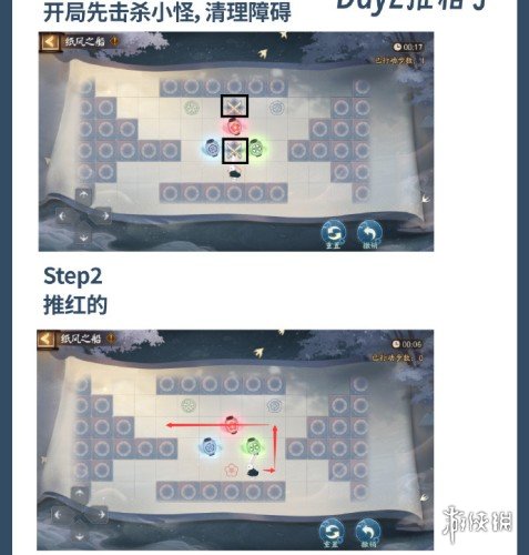 1、先将小怪击杀,之后逆时针推红箱子。