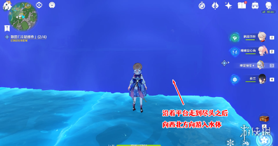 7、击破水泡后到达平台进入空间,贴着右边游,之后将水泡击破游到水体中,再往西北游即可。