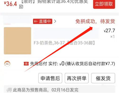 4. 当订单右上方显示出一排“免拼成功,待发货”的红色字体时,就代表这个订单免拼成功,接下来等待收货就可以了。
