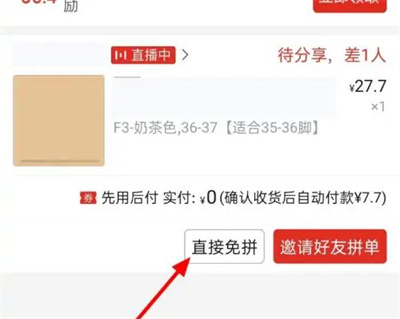 3. 进入待分享的订单页面后,在其中未拼单成功的订单下有一个“直接免拼”的按钮,看到后在上面点击。