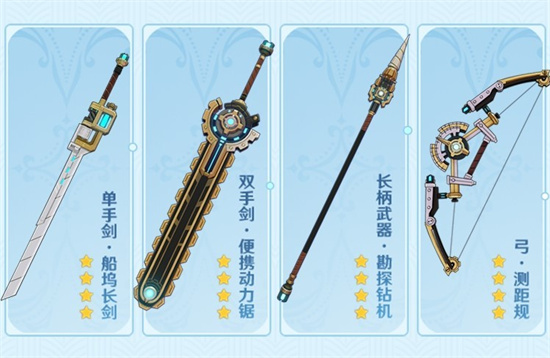 在本次卡池中,我们还迎来了四把崭新的四星武器。它们分别是船坞长剑、勘探钻机、测距规和便捷动力锯。特别值得一提,便捷动力锯采用了弓箭的造型,可以进行远距离射击。勘探钻机则是一把长柄武器,形状酷似长枪。动力锯则是一把双手剑,剑刃呈锯齿状,非常像一把锯子。船坞长剑则是一把单手剑。