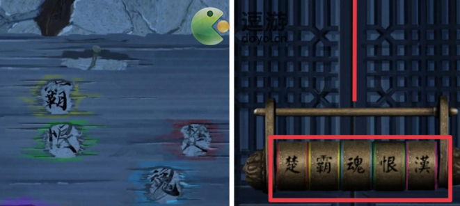 5、点击墙上的字,放上【带孔木板】,获得线索(霸-黄色、恨-绿色、楚-红色、魂-蓝色、漢-绿色)