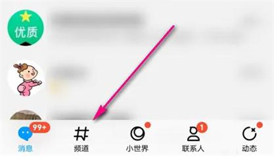 1. 打开手机qq进入界面后,在底部的状态栏里点击第二个“频道”切换进入。
