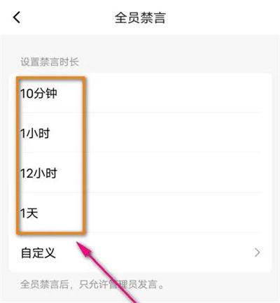 5. 最后在进入的页面里根据自己的需要设置禁言时长,在时间上自行选择,也可以点击“自定义”进入去设置时间。