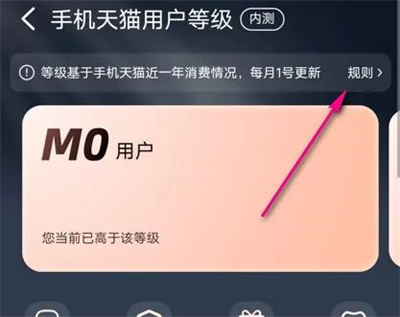 3. 进入到手机天猫用户等级页面后,在右上方有一个“规则”入口,看到后在上面点击。