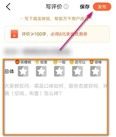 6. 最后在写评价页面里输入15字以上的评价内容,并点击右上方的“发布”按钮即可。