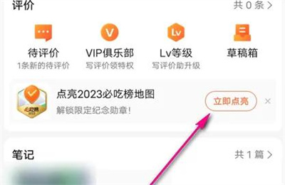2. 在我的页面中间部分会看到有一个“点亮2023必吃榜地图”,在它的后面点击“立即点亮”按钮。