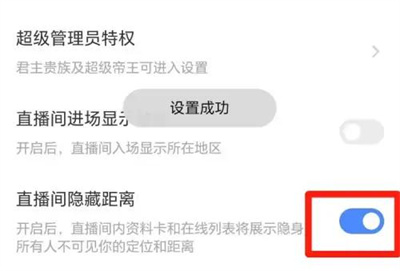 3.接下来,在直播设置里下方部分找到“直播间隐藏距离”这一项,在它的后面会看到有一个开关按钮,点击上面的滑块把它设置为灰色的关闭状态。在直播间内的所有人就不会再看到你的定位和距离信息。