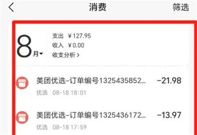 3.接下来,进入到了消费页面里,在其中可以查看到自己在美团优选中的支出、收入等记录,在右上方还可以点击“筛选”来进行查看。