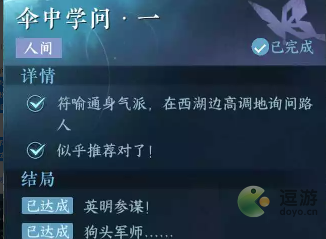 注:如果伞中学问一和二都达成了结局狗头军师,可以获得成就「人家问地你答天」