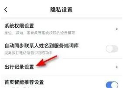 4.进入隐私设置页面后,在其中找到“出行记录设置”,在上面点击选择。