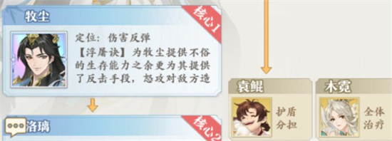 推荐大家的阵容搭配角色主要为牧尘+洛璃+袁鲲+赵牧神+木霓+青阳这个阵容。在游戏的后期可以作为一个防守力很强,并且能够随时准备反击的队伍,因为牧尘和洛璃这两个人物的输出能力非常的高。可以利用伤害反弹和降怒反击两种攻击方式让敌人无从下手,此时青阳的加成能力对于整个团队来说也是很重要的。