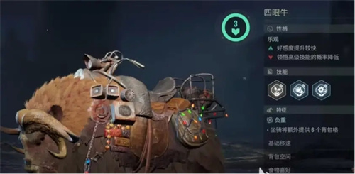 一旦被驯化,你就可以乘坐四目兽,体验四目兽迅捷的速度和强悍的战斗力。四眼牛群将会是你在这个荒芜的世界里最忠诚的同伴,帮助你战胜一切困难。四眼牛号将会带你快速的穿过这个荒芜的世界,大大的减少了旅行的时间,提高了你的工作效率和探索效率。四目牛兽不但能够提升你的战斗力,而且还拥有特殊的格斗技巧,提高你在这片荒芜的土地上的存活率。四眼牛马是独一无二的坐骑,它将赋予你独一无二的个性与魅力,使你在这个荒芜的世界里鹤立鸡群。
