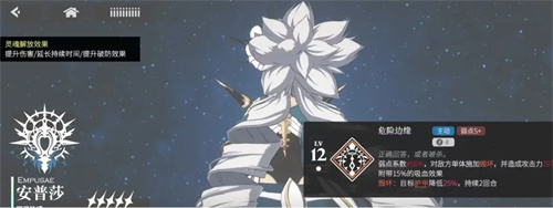 安普莎是个软肋,如果她在餐厅里工作的好,那她的工作效率就会大大提升。一技能【致命之境】,攻击力极强,攻击力高达456%,可以对单个目标造成毁灭性的伤害,并且吸收15%的生命值。毁灭是一种 BUFF,可以在两次攻击中大幅度降低目标的防御力。灵魂解放的效果是增加伤害,延长持续时间,增加破除防御的能力,这是一个全方位的提升。
