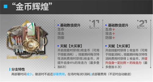 如果你不计划使用琳琅诗怀雅,那么“金币辉煌”也不值得开启。因为它的适用范围有限,性价比较低,只有经常使用这个干员的玩家才值得考虑开启这个模组。