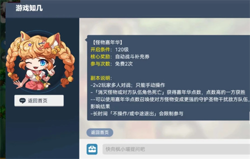 这个副本在游戏里面属于是多人对战的形式,所以各位玩家如果想要参加这个怪物嘉年华的副本的话,玩家首先要找好自己的伙伴,在这个副本里面采取的是二对二的模式,并且玩家在这款游戏里面是没有办法进行自动战斗的,只能选择手动操作,所以会比其他副本的难度大一些。各位玩家如果想要挑战这个副本的话,可以提前练习一下手动操作。