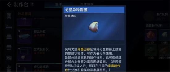 作为一件珍贵的紫装家具,他必须要拿到设计图,这件设计图只有在5级的庄园才能拿到,而设计图就是从制作台那里拿到的。主要材料有:菱形锰矿石,沙漠中的异种花瓣,杨树,软锰矿石,以及大量的木材。木头是一种很常见的东西,可以通过砍树,也可以通过拆卸木头来获取,我想大部分的玩家都有自己的存货,就不多说了。软锰矿是尖叫沙漠中特有的一种矿物,只有在开采的时候才会出现,这是一种很好的催化剂,而杨树也在尖叫沙漠中随处可见,任何一种都有可能出现。