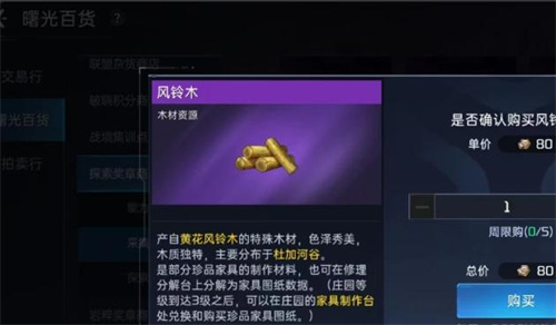 如果一些玩家运气不好或者实在赶时间,想要得到风铃木的话,那么你可以前往探索奖章商店中去获得,但是也不是免费就能够得到的,我们需要拥有很多的探索奖章才可以去兑换。一般来说想要是做家具都需要一些紫色级别的上等资源,怎样获得他们也可以和游戏里的其他玩家进行交易。因为很多玩家都需要金条来提升自己的战力,这时我们就可以用金条去兑换他们的风铃木。