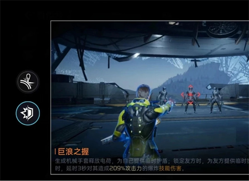 虽然护盾并不算特别厚,但它对生存有很大的帮助。银色旋涡的制作技能有两个,分别是“动力洪流”和“巨浪之握”。动力洪流所提供的技能旨在提供防御型伤害的保护。通过简单的按钮按住操作即可迅速展开护盾,以有效防止对手发起攻击造成的伤害,并将受到的伤害转换为强大的能量电荷。只需释放按钮即可收集的电荷释放出来,而释放后的攻击力数值将因击中敌人而获得显著提升。使用该技能时,电荷将持续集中并存储,同时攻击力将最高提升至三倍输出水平。此外,巨浪之握将通过生成机械手套的形式进行电荷释放,以便为自身提供短暂但有效的保护护盾。