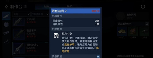 首先,让我们看看银色旋涡这款枪械的主要攻击特点。它的攻击力和技术速度都处于标准配置水平,没有太多特别之处。如果获得50级的顶级型号,可以获得两条固定属性和一条随机属性。然而,属性的强度取决于其类型。厂牌特效为“动力中心”,其作用是在使用技能或射击命中,或是受到伤害时,将累计能量值转化为晶化护甲。此护甲可以为自身和队友提供临时护盾,从而提高生存能力。